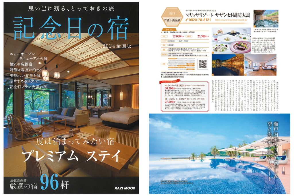 「マリッサリゾート サザンセト周防大島」からの最新情報をお届けします すべて お知らせ館内イベント情報レストラン・ラウンジ地域観光情報営業変更 メンテナンス情報過ごし方メディアイベントカレンダー 2024.07.29 記念日の宿 2024年 全国版 掲載いただきました 記念日の宿 2024年 全国版 KAZI MOOK 2024年7月31日発売 定価1,540円(税込) Tweet Categories: お知らせ, メディア Back Next 記事一覧へ