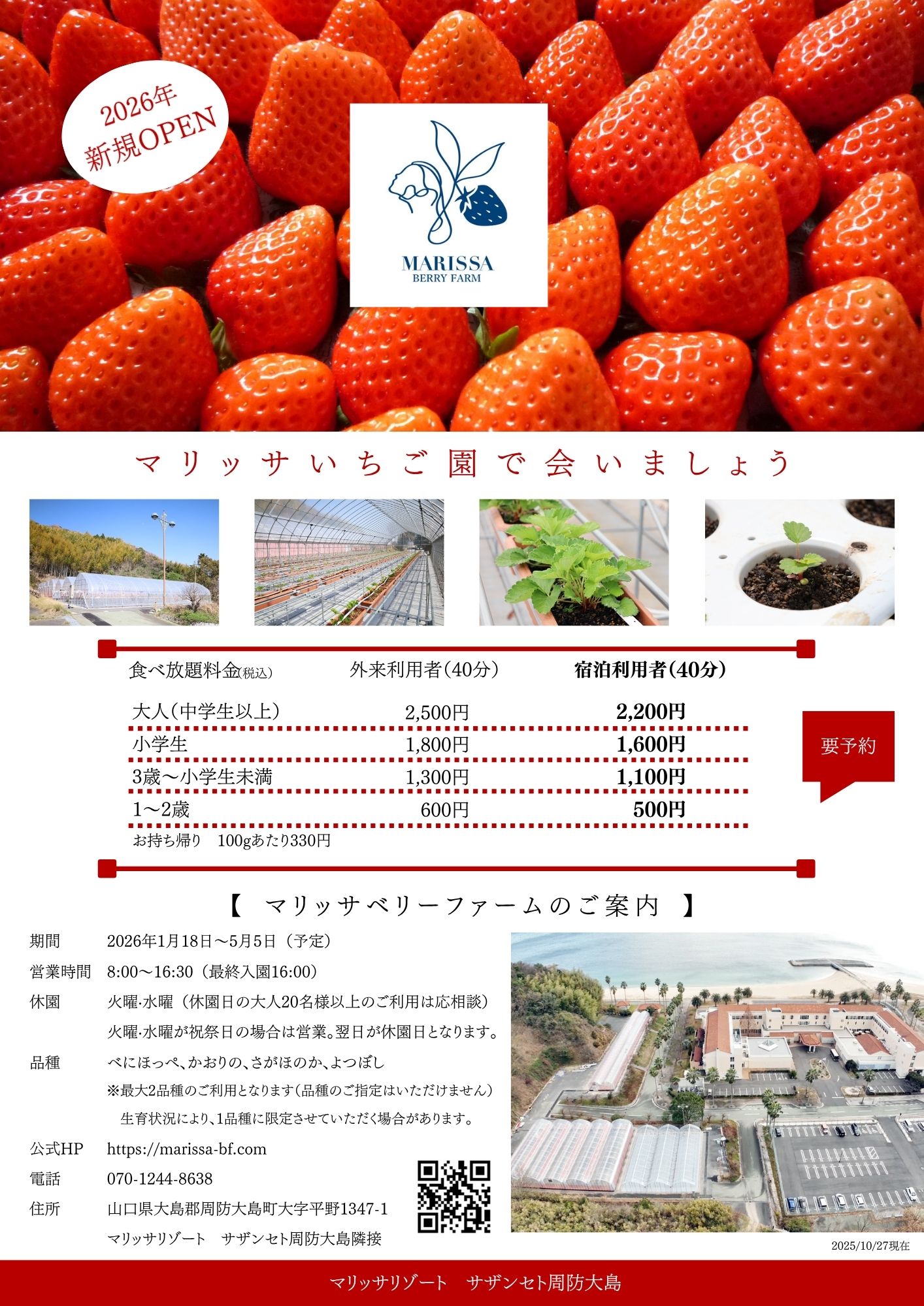 2026年1月18日の開園を予定しております。いちご狩りや、いちご園で収穫したいちごを使用した商品などの販売を予定しております。詳しくは、マリッサ ベリーファーム公式HPでご覧ください。